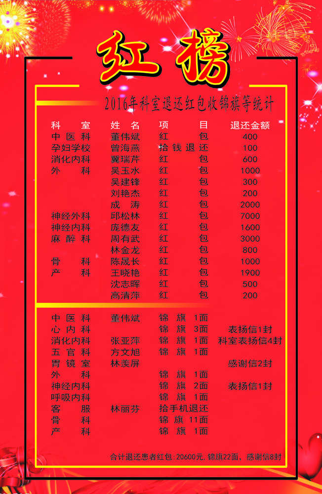 自開業(yè)以來,隨著盛興醫(yī)院各項(xiàng)工作不斷得到社會和患者的認(rèn)同,病人收治數(shù)量持續(xù)增加,醫(yī)務(wù)人員越來越受到患者及其家屬的認(rèn)同。一些患者以種種原因?yàn)橛桑蚋骺剖裔t(yī)務(wù)人員贈送紅包,答謝他們的勞動。