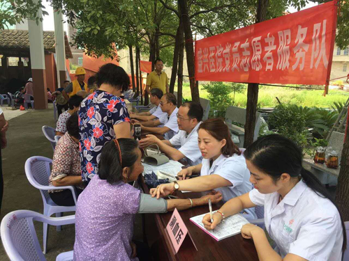 志愿者由慢性病科主任、黨員黃麗仙帶隊,骨科副主任、黨員黃益平、心內(nèi)科主任李培添、外科主任醫(yī)師、黨員余永飛、五官科副主任醫(yī)師溫新建等客服組成服務(wù)隊,為100余名村民進(jìn)行診治,解答他們的健康問題。同行的護(hù)士為村民測量血壓、查體等。