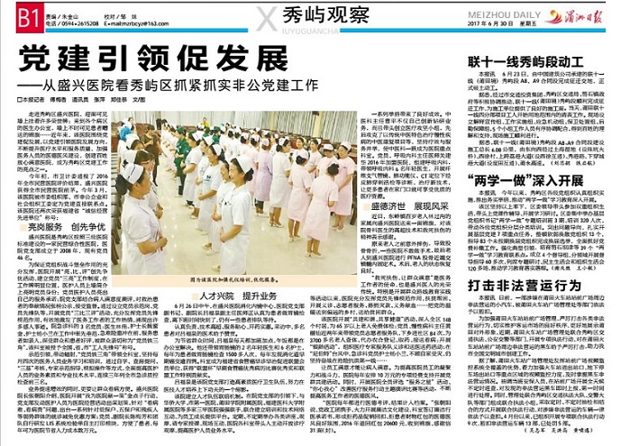 前言:盛興醫(yī)院是秀嶼區(qū)按照三級醫(yī)院標準建設(shè)的一家民營綜合性醫(yī)院,現(xiàn)有員工516人。醫(yī)院黨支部成立于2008年12月,現(xiàn)有黨員46名,其中正式黨員14名、預備黨員4名、“雙報到”黨員28名。醫(yī)院黨支部成立以來,緊緊圍繞黨建促發(fā)展,構(gòu)筑四個平臺,發(fā)揮四個作用,提升醫(yī)院服務(wù)水平。醫(yī)院先后被省、市、區(qū)誠信促進會授予誠信企業(yè)先進單位;被市總工會授予先進職工小家和職工書屋;急診科先后被全國、省、市總工會授予“工人先鋒號”;重癥醫(yī)學科被省總工會授予“五一巾幗標兵崗” 等榮譽稱號。今年3月被市委組織部、市非公企業(yè)和社會組織工委定為黨建直接聯(lián)系點。