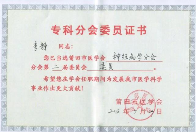 熱烈祝賀盛興醫(yī)院神經(jīng)內(nèi)科主任   李靜 當(dāng)選莆田市醫(yī)學(xué)會(huì)   神病學(xué)分會(huì)第二屆……
